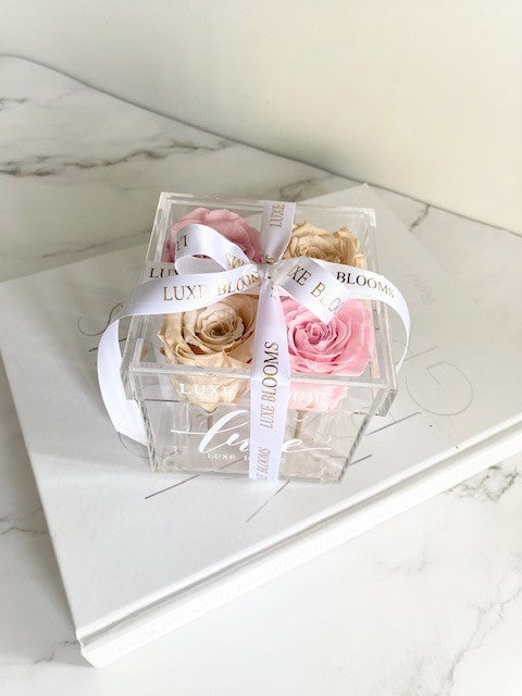 Four of our best-selling preserved roses displayed beautifully in our clear acrylic box. The acrylic box protects the roses while displaying their beauty from all angles. The roses are displayed on a gold stem.